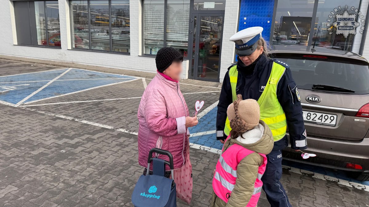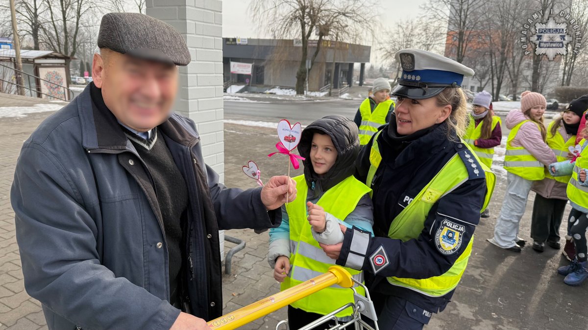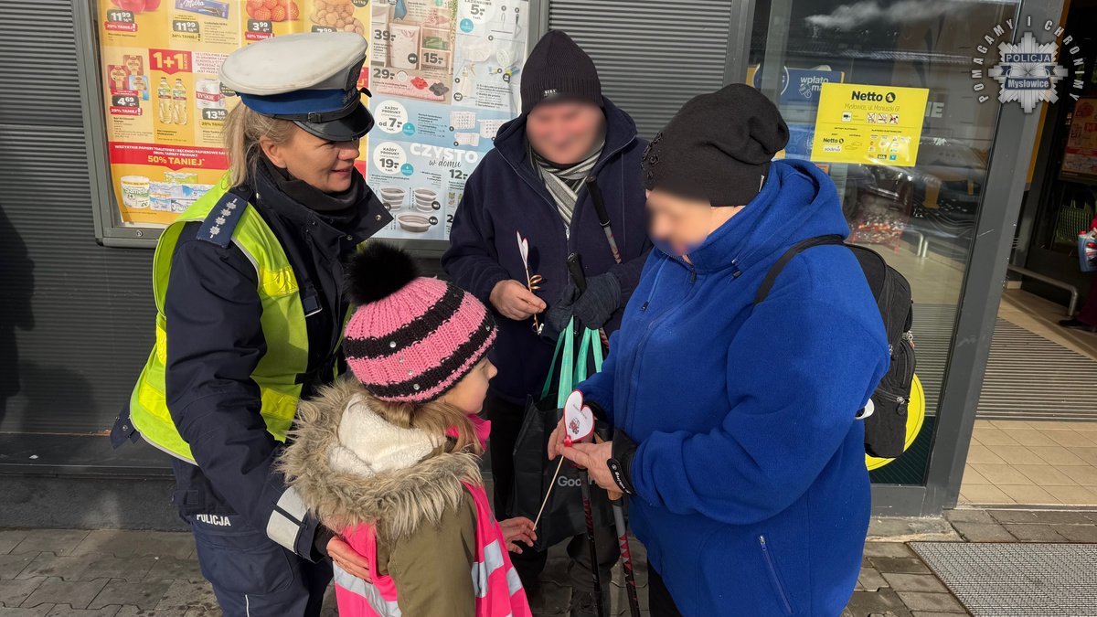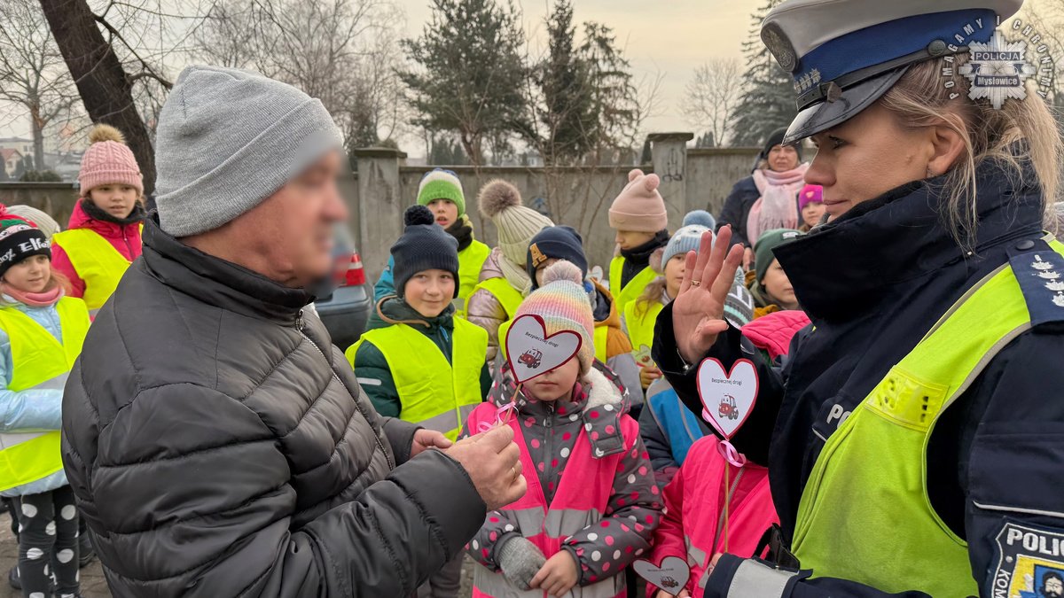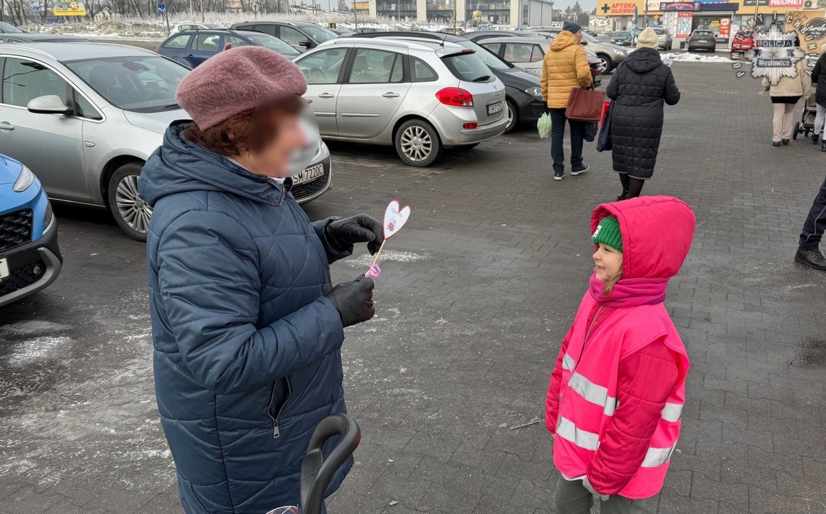 Policjanci z mysłowickiej drogówki zorganizowali dziś akcję wraz z dziećmi ze Szkoły Podstawowej numer 9. W trakcie działań mundurowi przypominali seniorom zasady bezpiecznego uczestnictwa w ruchu drogowym. Dzieci przygotowały dla napotkanych babć i dziadków serduszka, przypominające by być bezpiecznym na drodze.