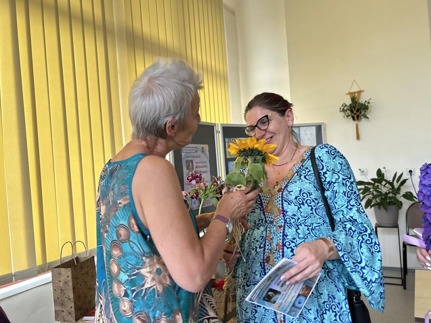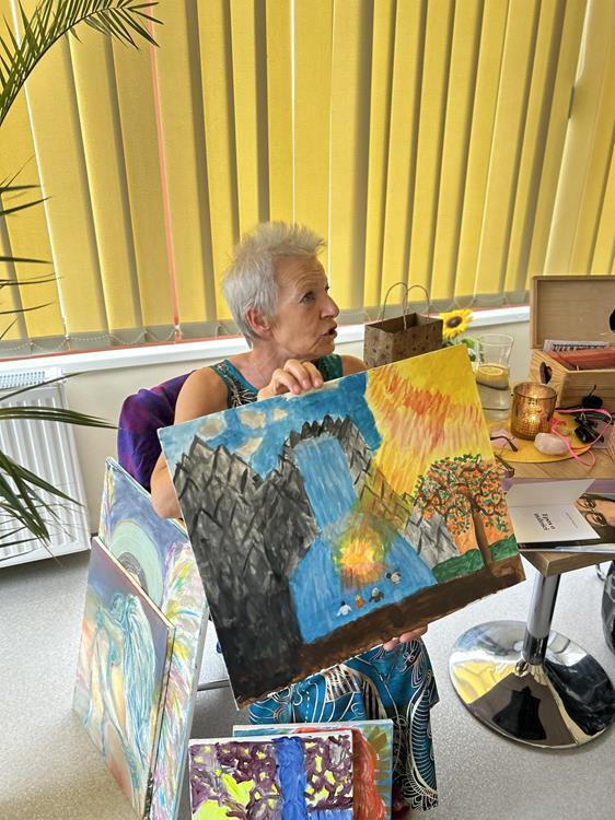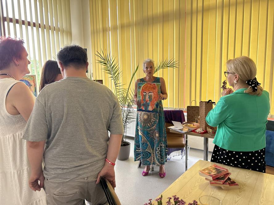 Aleksandra Walkowicz to malarka, poetka, animatorka kultury i terapeutka sztuki, której twórczość przenika się na wielu poziomach. Jej obrazy i wiersze ukazują wewnętrzne przemiany, emocje oraz duchową harmonię. Podczas finisażu artystka zaprezentowała m.in. poezję z najnowszego tomiku „Epos o miłości”, a jej emocjonalna recytacja wprowadziła słuchaczy w wyjątkowy nastrój.