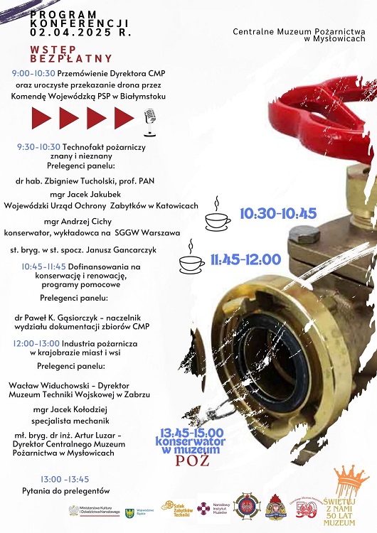 2 kwietnia w Centralnym Muzeum Pożarnictwa w Mysłowicach odbędzie się konferencja muzealna, której tematem przewodnim będzie konserwacja i renowacja zabytków techniki pożarniczej. To wyjątkowe wydarzenie skierowane jest głównie do strażaków, którzy planują utworzenie w swoich remizach Izby Tradycji Pożarniczej, ale z pewnością zainteresuje także regionalistów, muzealników, kolekcjonerów i studentów nauk humanistycznych.