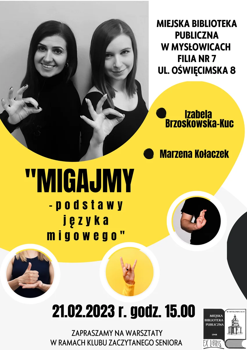 - 21 lutego o godz. 15.00 – Spotkanie Klubu Zaczytanego Seniora pod hasłem „Migajmy – podstawy języka migowego”, prowadzone przez Izabelę Brzoskowską–Kuc i Marzenę Kołaczek.