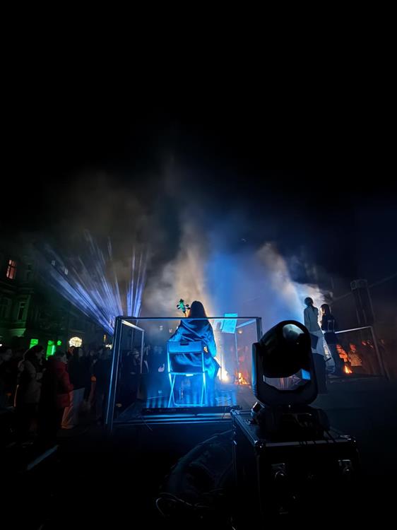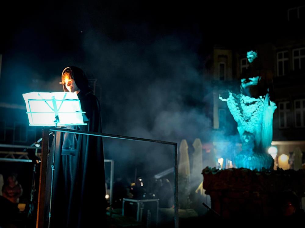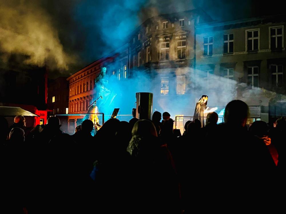 Podczas wydarzenia „Mysłowickie HALLO DZIADY” nie zabrakło symbolicznych gestów. Na rynku pojawił się świetlny mapping, który w niezwykły sposób rozświetlił przestrzeń, wprowadzając wszystkich w atmosferę zadumy. Fragmenty „Dziadów” w wykonaniu uczniów mysłowickich liceów w połączeniu z muzyką stworzyły niesamowitą aurę, która przypomniała o ważności pamięci i tradycji.