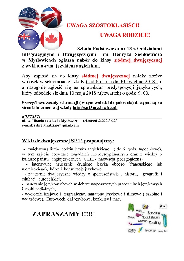 Szkoła Podstawowa nr 13 z Oddziałami Integracyjnymi i Dwujęzycznymi im. Henryka Sienkiewicza w Mysłowicach ogłasza nabór do klasy siódmej dwujęzycznej z wykładowym językiem angielskim.