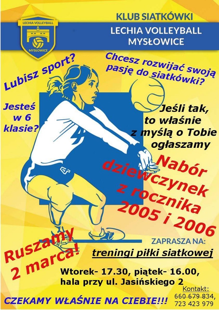 Klub Siatkówki Lechia Volleyball Mysłowice ogłasza nabór do sekcji piłki siatkowej dla dziewcząt z roczników 2005 i 2006.