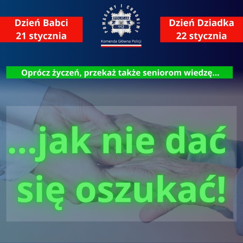 Dzień Babci i Dzień Dziadka to dobry moment, aby oprócz życzeń i prezentów, obdarować seniorów wiedzą, która pozwoli im skuteczniej bronić się przed niebezpieczeństwem ze strony oszustów. Jednym z najlepszych prezentów, jakie możesz dać swoim ukochanym dziadkom to częste odwiedziny, nie tylko od święta, oraz poświęcony im czas i wspólne rozmowy o bezpieczeństwie.