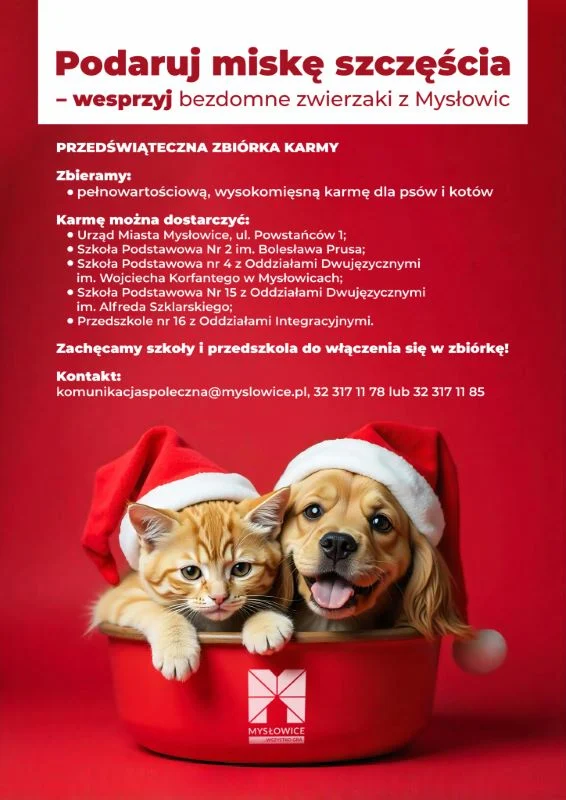 Urząd Miasta Mysłowice organizuje zbiórkę pełnowartościowej, wysokomięsnej karmy dla psów i kotów ze schroniska. Akcja jest skierowana do wszystkich mieszkańców miasta oraz w szczególności placówki oświatowe – szkoły, przedszkola i inne instytucje edukacyjne – do włączenia się w zbiórkę.