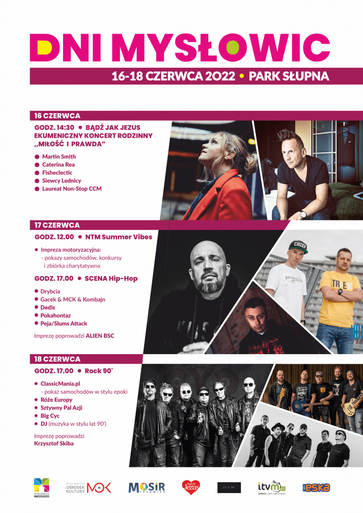 Dni Mysłowic rozpoczną się w czwartek, 16 czerwca od koncertu ewangelizacyjnego „Bądź Jak Jezus”. To wydarzenie, które od 2010 roku przyciąga wielotysięczną publiczność z Polski i z zagranicy. Celem Koncertu od początku jest budowanie jedności w wymiarze religijnym, rodzinnym i społecznym. W tym roku na scenie zaprezentują się Martin Smith, Caterina Rea, Fisheclectic, Siewcy Lednicy oraz laureat Non-Stop CCM. Koncert staruje o godzinie 14:30.