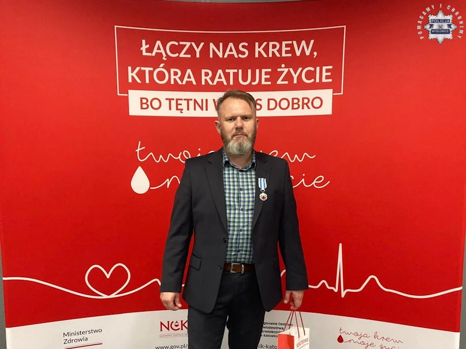 Sierżant Krzysztof Krawczyk został wyróżniony odznaczeniem „Honorowy Dawca Krwi – Zasłużony dla Zdrowia Narodu”. Przysługuje ono dawcom krwi, którzy oddali co najmniej 20 litrów tego życiodajnego płynu lub odpowiadającą tej objętości ilość jej składników. Mysłowicki policjant w ciągu 10 lat oddał 21 litrów krwi! Wyróżnienie odznaczeniem nadawane jest przez ministra zdrowia. Serdecznie gratulujemy!