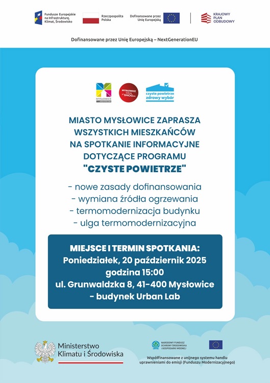 Urząd Miasta Mysłowice serdecznie zaprasza wszystkich zainteresowanych mieszkańców na spotkanie informacyjne dotyczące Programu „Czyste Powietrze”, które odbędzie się 20 października (poniedziałek) o godzinie 15:00 w przestrzeni Urban Lab przy ul. Grunwaldzkiej 8.