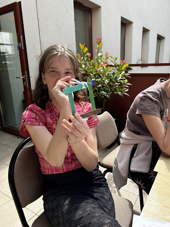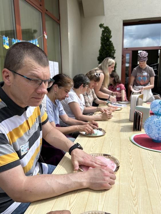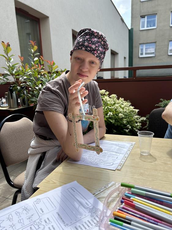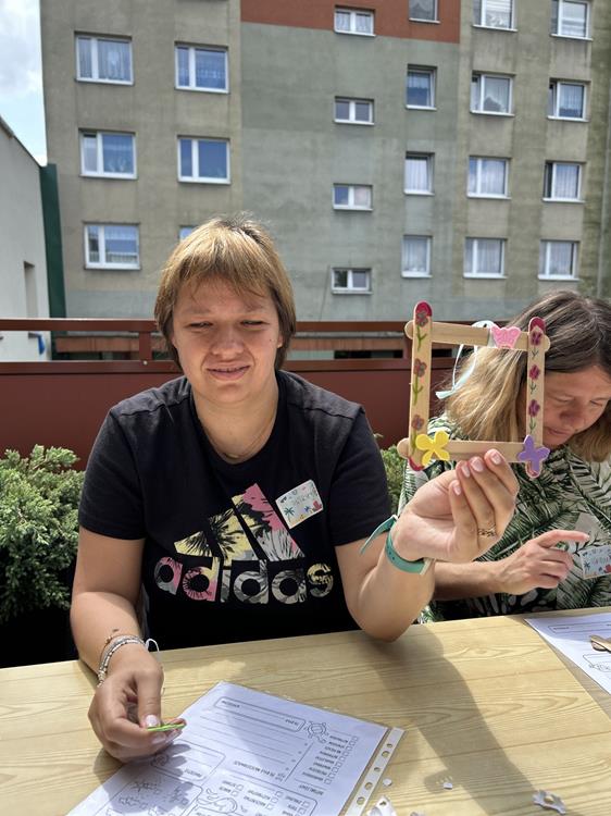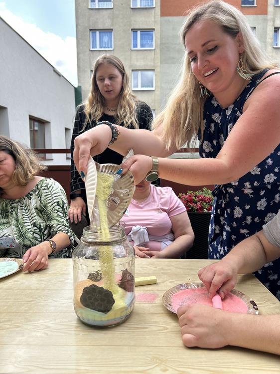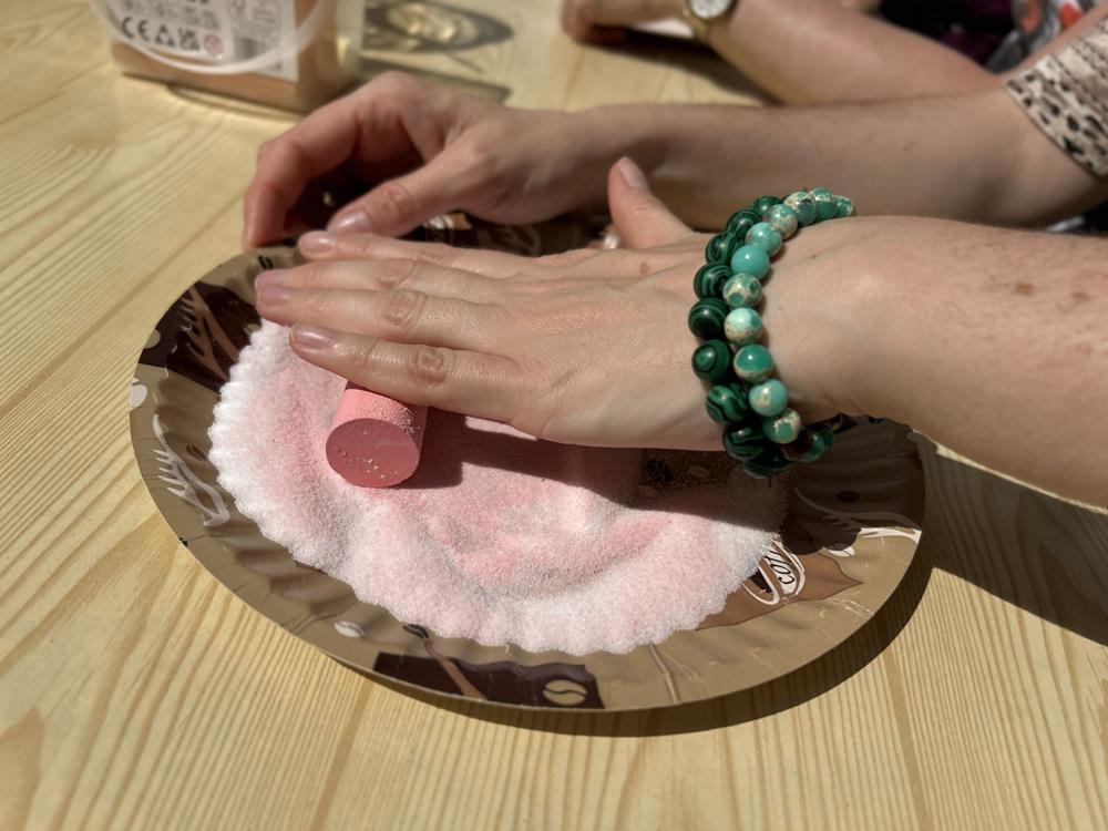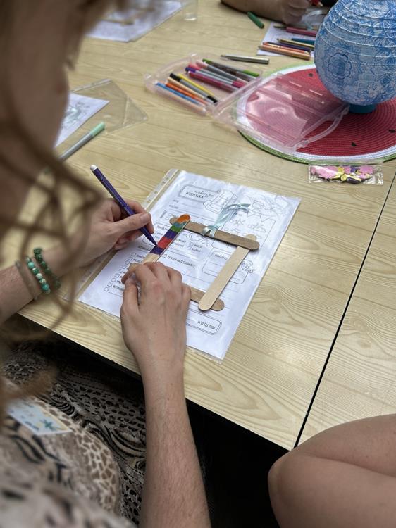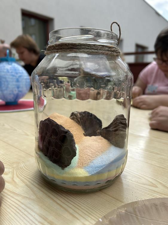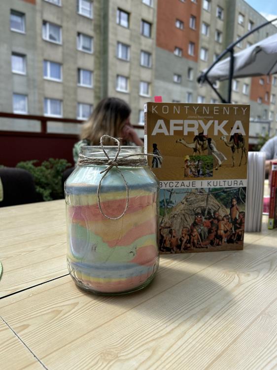 Po wspólnej lekturze, uczestnicy przystąpili do tworzenia pustyni z soli barwionej kredą. Zabawa z kolorami i fakturami wprowadziła w atmosferę relaksu, umożliwiając wyrażenie emocji poprzez sztukę. Ozdabianie ramek na zdjęcia stało się symbolem wspomnień, a rozwiązywanie krzyżówek dostarczyło dodatkowej rozrywki.