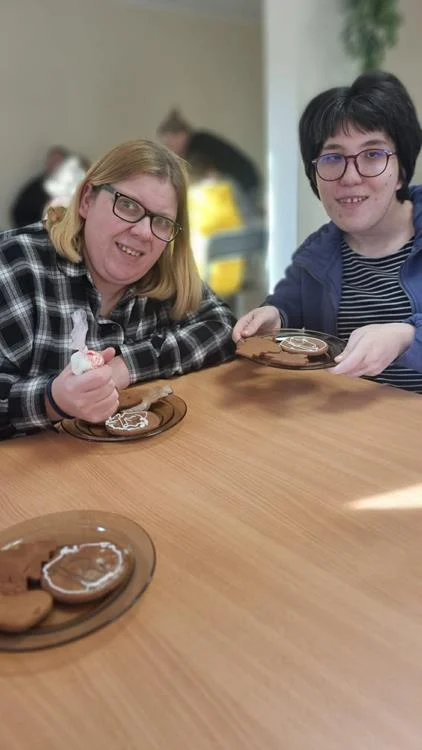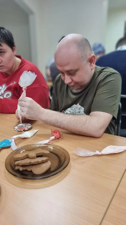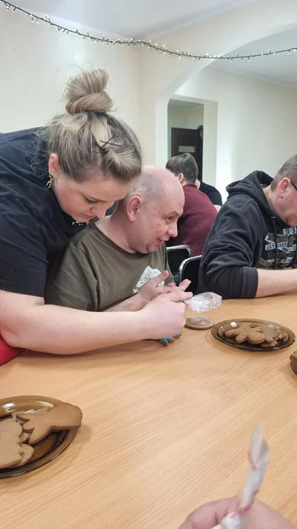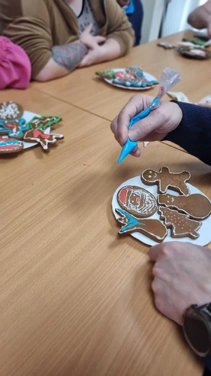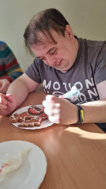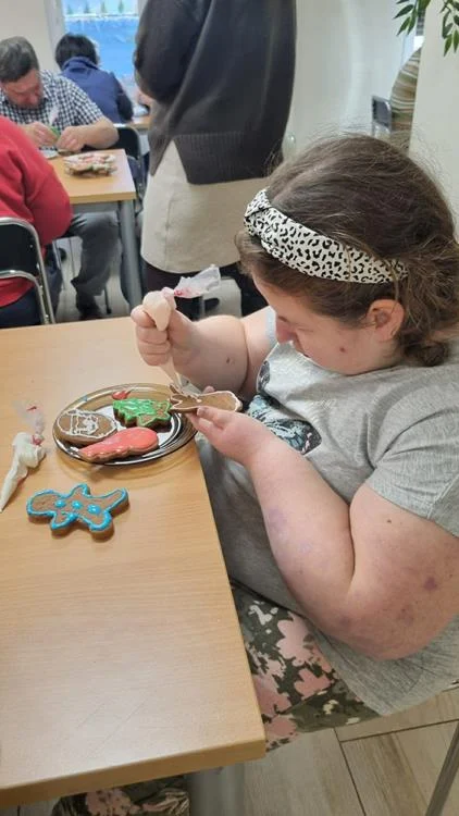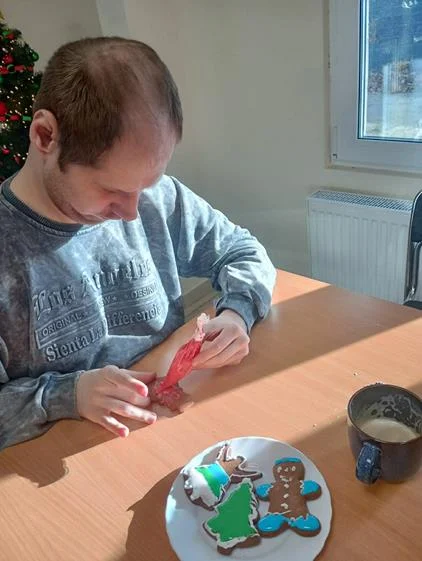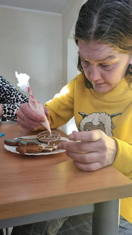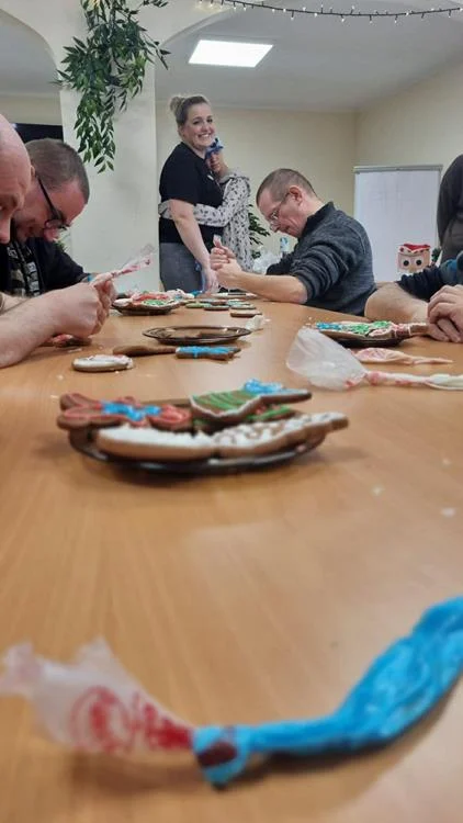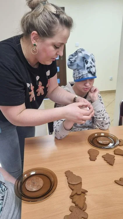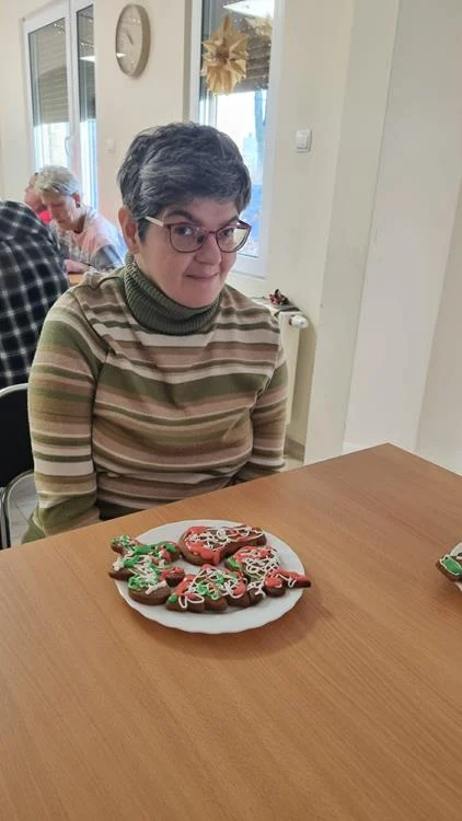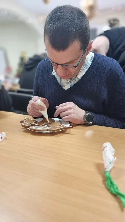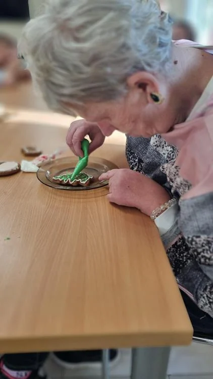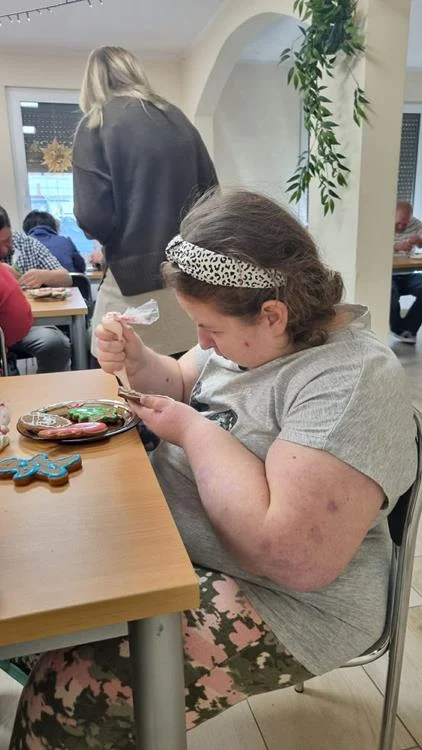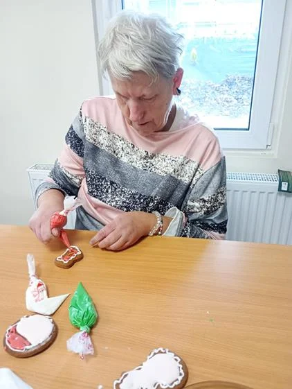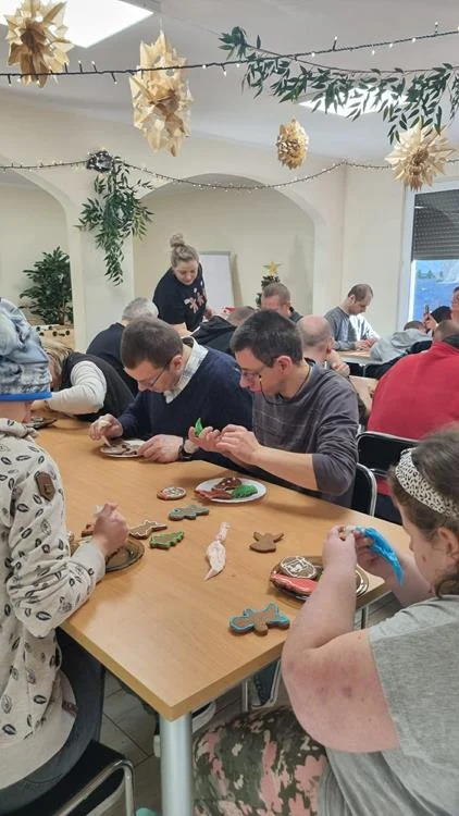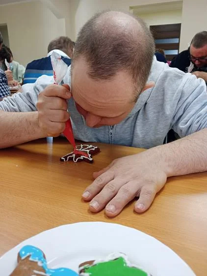Zwieńczeniem spotkania była wspólna dekoracja pierniczków, które uczestnicy przygotowali podczas wcześniejszych zajęć. Kolorowe lukry, cukrowe ozdoby i fantazyjne wzory nadały wypiekom indywidualny charakter, a sam proces dekorowania stał się okazją do rozmów, śmiechu i wzajemnego wsparcia. Wspólne działania i radość z pracy twórczej sprawiły, że ten dzień zyskał wyjątkową, świąteczną atmosferę.