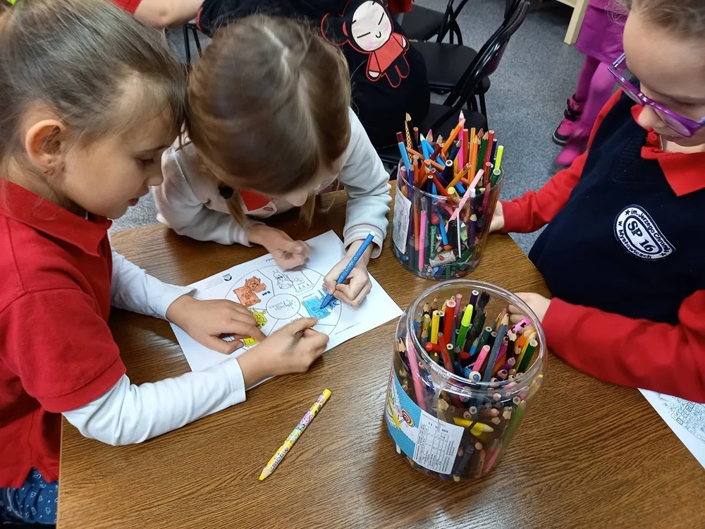 Uczestniczący w warsztatach uczniowie klasy pierwszej Szkoły Podstawowej nr 16 poznali podstawowe zasady segregacji odpadów, a także proces odzyskiwania surowców z produktów odpadowych i wykorzystywanie ich do produkcji nowych, poszukiwanych towarów. W ramach ćwiczeń dydaktycznych pierwszoklasiści przyporządkowywali do odpowiednich pojemników różne odpady, a na zakończenie rozwiązywali krzyżówkę i kolorowali obrazek – Piątka za segregację.