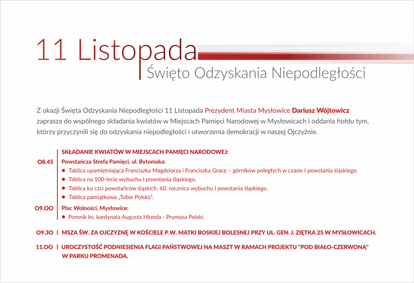 Urząd Miasta Mysłowice zaprasza do zapoznania się z programem obchodów Dnia Niepodległości.