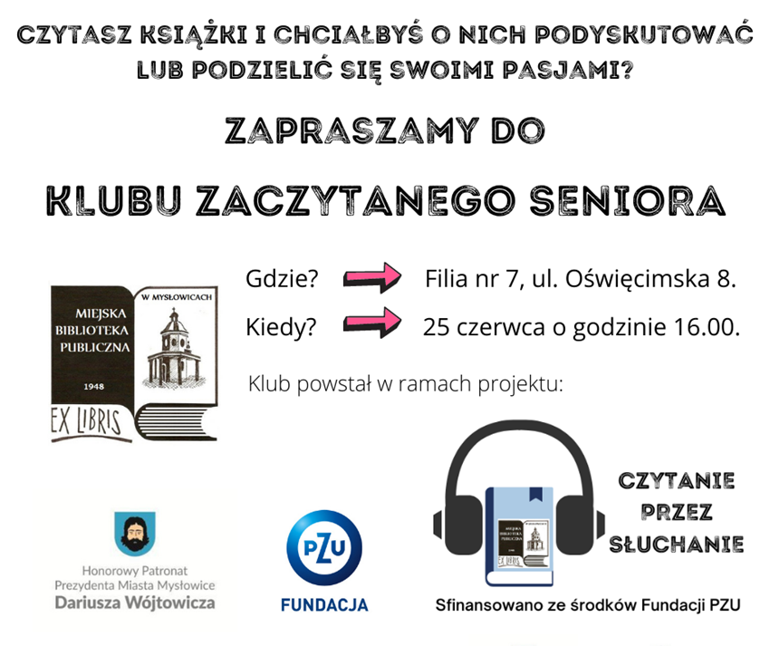 Z radością informujemy, że Fundacja PZU przyznała nam dotację na realizację projektu „Czytanie przez słuchanie”, nad którym Honorowy Patronat objął Prezydent Miasta Mysłowice Dariusz Wójtowicz. Projekt ma na celu utworzenie w Filii nr 7 przy ul. Oświęcimskiej 8 Klubu Zaczytanych Seniorów, który na wzór Dyskusyjnych Klubów Książki umożliwi obcowanie z literaturą oraz swobodne dyskusje o wspólnie czytanych książkach, a także wzbogacenie księgozbioru Biblioteki o nowe audiobooki i książki