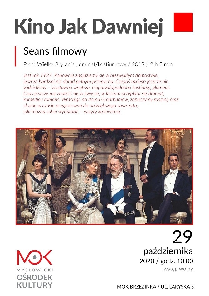 Drugi z seansów z cyklu Kino jak dawniej - projekcji filmowych, przygotowanych z myślą o seniorach, to opowieść o rodzinie Crawleyów i ich oddanej służbie. Zrealizowany z rozmachem film to kontynuacja przygód, które zobaczyć mogliśmy w serialu o tym samym tytule.