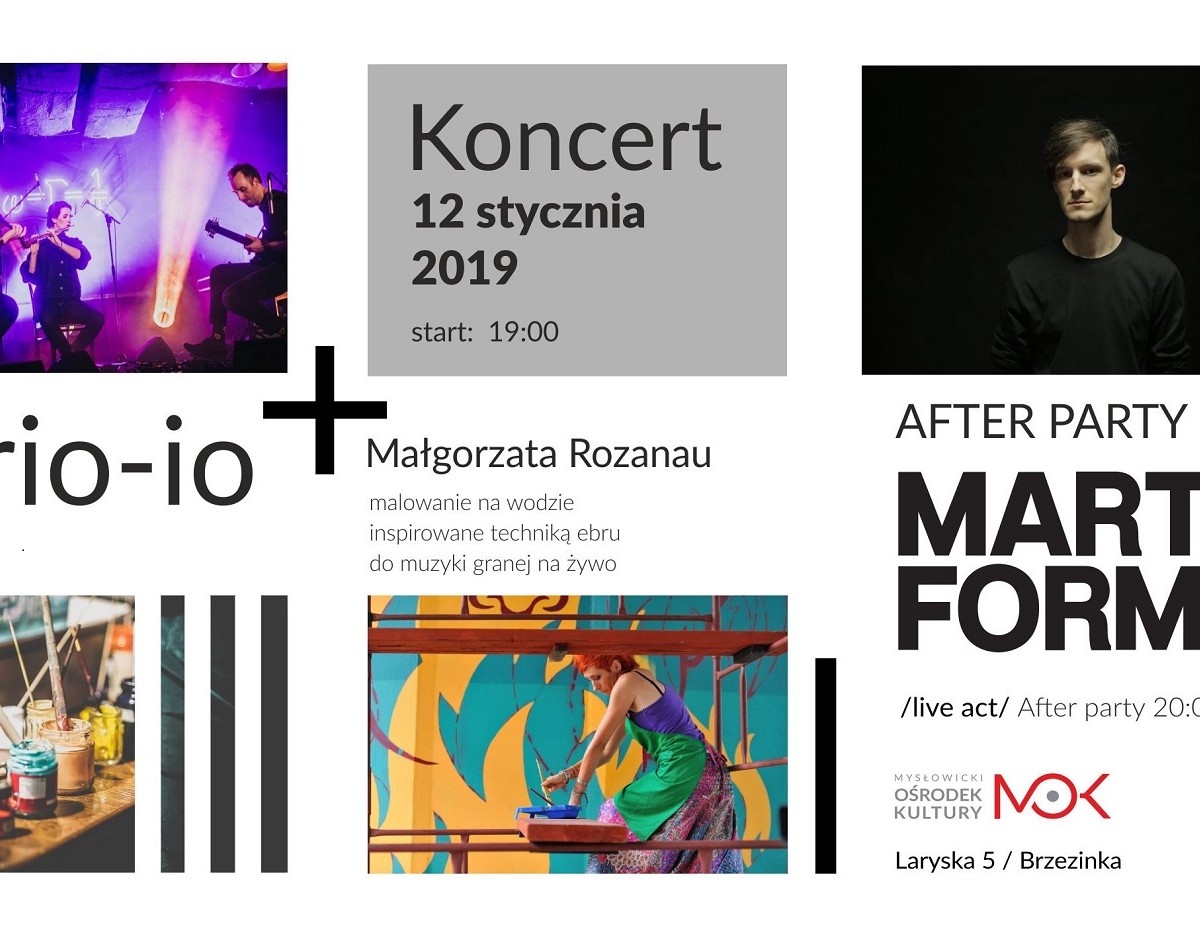 Zapraszamy na koncert elektro-akustycznego zespołu Trio io, podczas którego malarka Małgorzata Rozenau wykona obraz na wodzie, inspirowany techniką ebru okulu. A już o 20.00 after party, na którym zagra DJ Marte Forms.