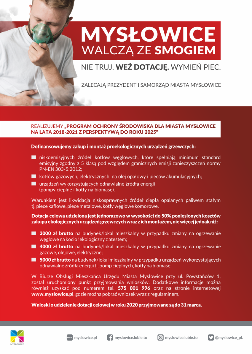 W ramach programu „Czyste powietrze” został uruchomiony w Urzędzie Miasta Mysłowice przy ul. Powstańców 1 (pokój 308 B) został uruchomiony punkt przyjmowania wniosków, gdzie w każdą środę można uzyskać informacje o programie oraz wypełnić i złożyć wniosek – mieszkańcy Miasta Mysłowice są zobligowani do składania wniosków w naszym mieście. Dodatkowych informacji można uzyskać pod numerem tel. 575 001 992 lub 533 735 347 oraz na stronie internetowej www.wfosigw.katowice.pl Wnioski o udzielenie dotacji celowej przyjmowane są do 31.12.2027 r.