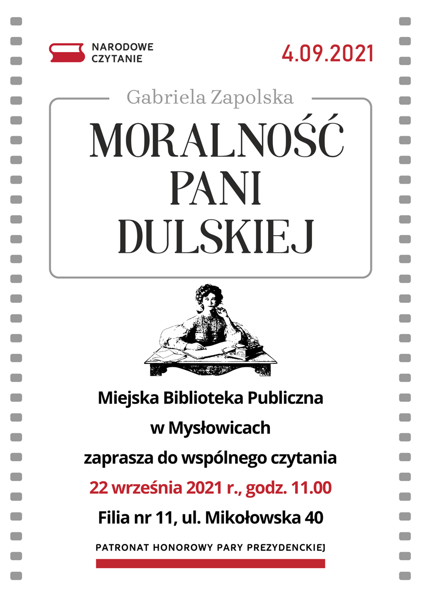 Filia nr 1 Miejskiej Biblioteki Publicznej w Mysłowicach zaprasza na wspólne czytanie fragmentów dramatu "Moralność Pani Dulskiej" G. Zapolskiej w ramach akcji Narodowe Czytanie.