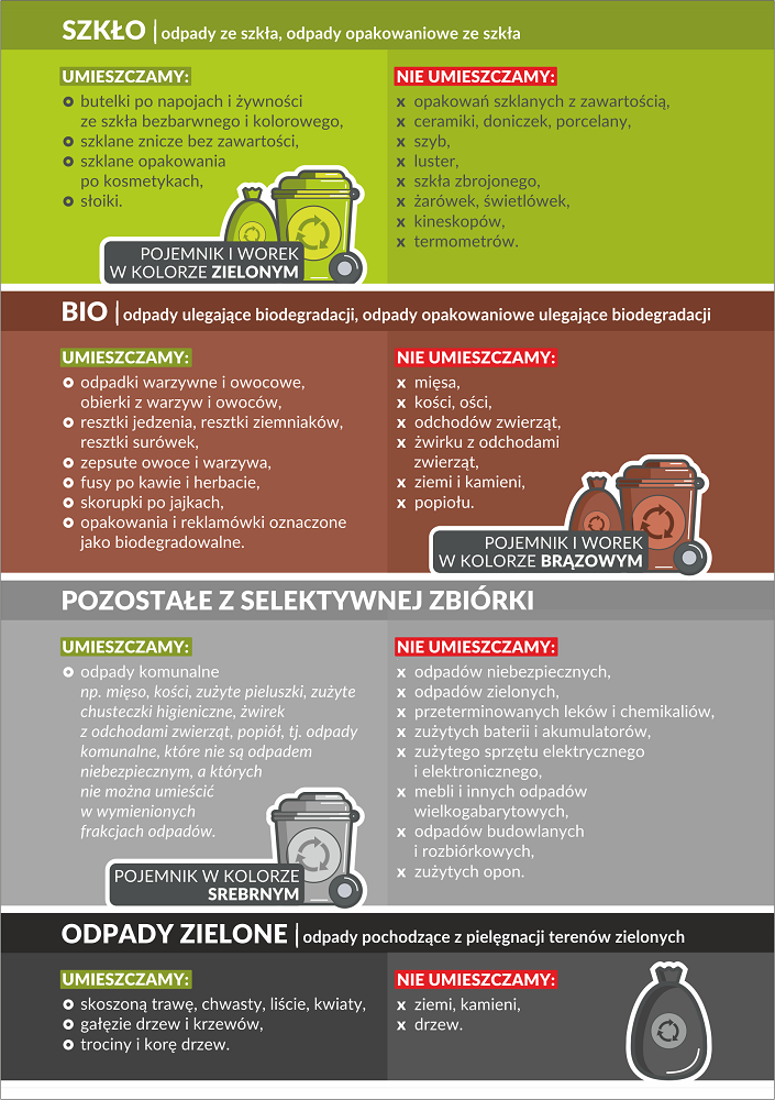 SZKŁO - odpady ze szkła, odpady opakowaniowe ze szkła (ikona pojemnika i worka w kolorze zielonym). Umieszczamy: butelki po napojach i żywności ze szkła bezbarwnego i kolorowego, szklane znicze bez zawartości, słoiki, szklane opakowania po kosmetykach. Nie umieszczamy: opakowań szklanych z zawartością, ceramiki, doniczek, porcelany, szyb, luster, szkła zbrojonego, żarówek, świetlówek, kineskopów, termometrów.