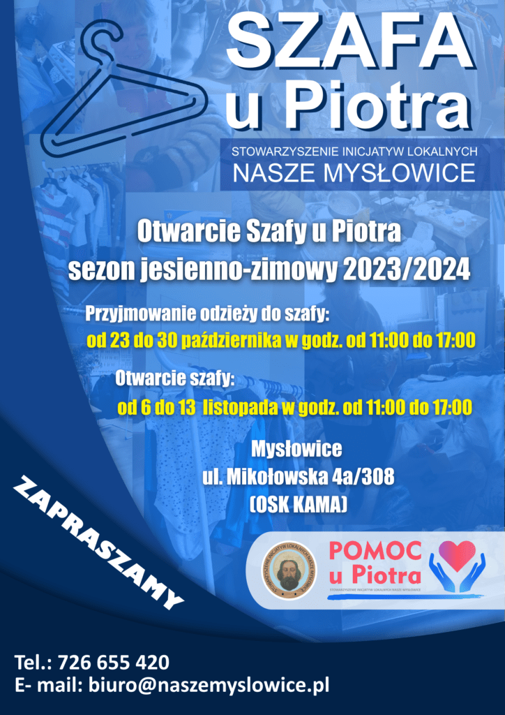 W dniach 6-13 listopada, w godz. 11:00-17:00 stowarzyszenie zaprasza zainteresowanych do nieodpłatnego odbioru odzieży jesienno-zimowej w siedzibie Stowarzyszenia przy ul. Mikołowskiej 4a, III piętro., pok.308. ( OSK KAMA ).