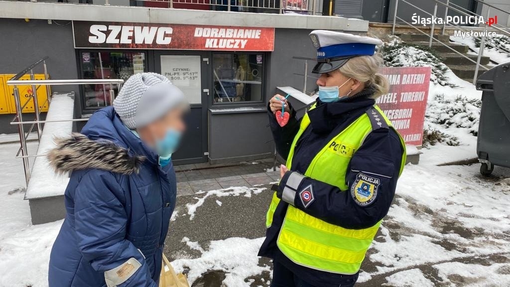 Policjanci mysłowickiej drogówki rozdawali seniorom serduszka wykonane przez przedszkolaków z okazji Dnia Babci i Dziadka.
