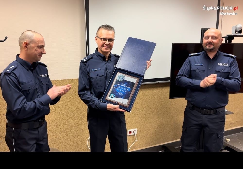 Podczas uroczystej zbiórki I Zastępca Komendanta Miejskiego Policji w Mysłowicach wraz z policjantami i pracownikami komendy pożegnał odchodzącego na emeryturę Eksperta ds. Kontroli podinsp. Jarosława Niziołka. Komendant Miejski Policji w Mysłowicach powierzył pełnienie obowiązków na tym stanowisku nadkom. Tomaszowi Kawala.