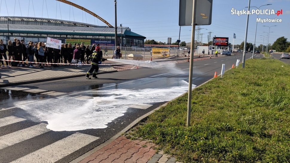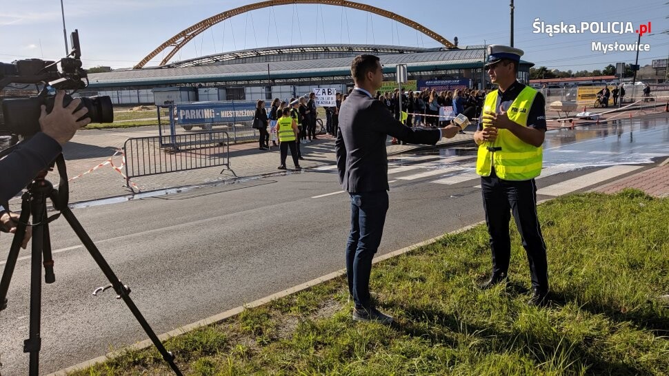 Między innymi dlatego w piątek przy ul. Obrzeżnej Północnej policjanci z Wydziałów Ruchu Drogowego KMP w Mysłowicach i KWP w Katowicach oraz przedstawicielami Automobilklubu Mysłowickiego przygotowali pokaz pn. "Prędkość i hamowanie". W pokazie udział wziął poszkodowany w wypadku rowerzysta, a gościem specjalnym wydarzenia był perkusista m.in. zespołu Myslovitz Wojtek Kuderski. Ubrana na czarno młodzież z I LO w Mysłowicach na transparentach prezentowała policyjne statystyki zdarzeń drogowych. Dodatkowym akcentem pokazu była trumna i worek, które symbolizowały dwie ofiary śmiertelne wypadków na drogach naszego miasta. Celem przeprowadzonych działań było wyrobienie wśród uczestników ruchu drogowego nawyku konieczności zachowania szczególnej ostrożności w rejonie przejść dla pieszych i dostosowania prędkości pojazdu do obowiązujących ograniczeń oraz warunków na drodze. Zgromadzeni na pokazie widzowie mogli zobaczyć jak zmienia się droga hamowania pojazdu w zależności od stanu nawierzchni drogi, a także od prędkości z jaką się porusza. W trakcie spotkania organizatorzy zwrócili też uwagę na niebezpieczne zachowania rowerzystów i przypomnieli zasady bezpiecznego poruszania się po drodze oraz przechodzenia przez przejście dla pieszych.