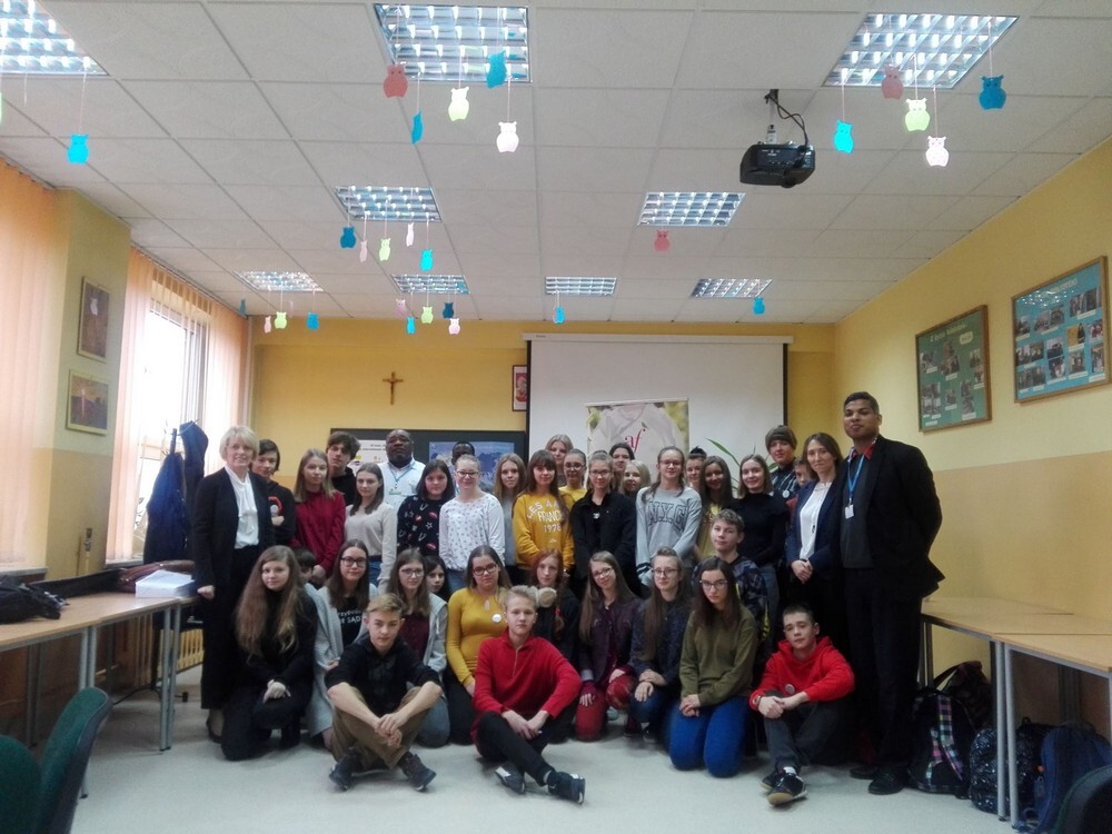 Dzięki współpracy z Panem Stephane Jolivet, Dyrektorem Ośrodka Alliance Française w Katowicach, 14 grudnia z wizytą do szkoły przybyli przedstawiciele Międzynarodowej Organizacji Frankofonii, odpowiedzialni za realizację programu zrównoważonego rozwoju: Pan Jean-Pierre Ndoutoum Directeur de l'Institut de la Francophonie pour le développement durable (IFDD) oraz Pan Issa Bado Attaché de programme Négociations internationales sur l’économie, l’environnement et le développement durable, biorący udział Szczycie Klimatycznym w Katowicach (COP24).