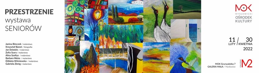 Wystawa "Przestrzenie" to prezentacja i dorobek twórczości mysłowickich seniorów, którzy swoje pasje artystyczne realizują, w Mysłowickim Ośrodku Kultury pod opieką plastyczki Ewy Borówki. Prace seniorów, które będzie można zobaczyć podczas wystawy, to zapiski ukazujące własną wizję rzeczywistości pełną zmian i ulotności. Każdy z nas w swoim otoczeniu tworzy indywidualną przestrzeń czasem tylko mały ślad, który pozostaje w pamięci. Obserwacje, wspomnienia, skojarzenia tworzą formy barw kolorystycznych, które stanowią niewyczerpalne źródło twórczych inspiracji. Seniorzy w swoich pracach prezentują własną przestrzeń. Przestrzeń, która może dostarczać niewyczerpalne źródło artystycznych tematów i inspiracji.