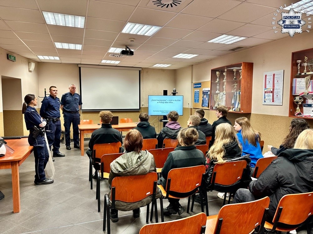 Uczniowie z II Liceum Ogólnokształcącego w Mysłowicach odwiedzili komendę. Uczniów z II klasy powitał Naczelnik Wydziału Prewencji Komendy Miejskiej Policji w Mysłowicach podinsp. Piotr Ślęzak, zachęcał zgromadzonych do wstąpienia w mundurowe szeregi.
