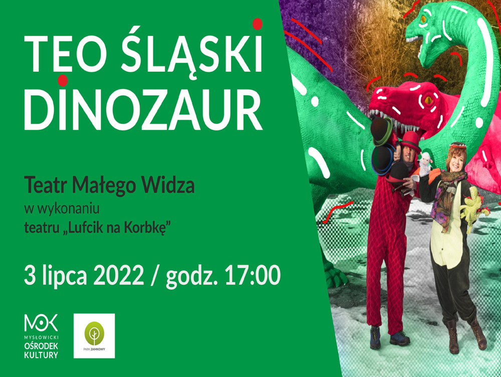 Nadchodzi iście familijna niedziela w Parku Zamkowym! Pamiętacie wyśmienite plenerowe spektakle na mysłowickim Rynku? W tym roku zagoszczą w zielonych okolicznościach przyrody tuż obok. Tym razem zaproszono do współpracy Teatr Lufcik na Korbkę z przedstawieniem „Teo, śląski dinozaur”.