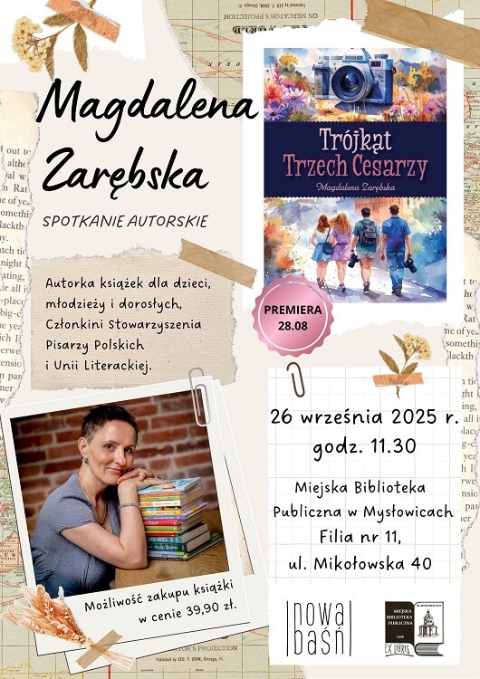 26 września w Miejskiej Bibliotece Publicznej w Mysłowicach odbędzie się spotkanie autorskie z Magdaleną Zarębską, autorką najnowszej powieści dla młodzieży pt. „Trójkąt Trzech Cesarzy”. Spotkanie rozpocznie się o godzinie 11:30 w Filia nr 11, przy ul. Mikołowskiej 40.