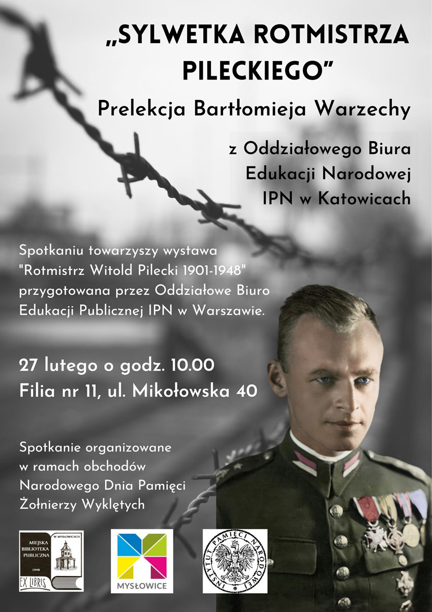 Miejska Biblioteka Publiczna w Mysłowicach serdecznie zaprasza na prelekcję Bartłomieja Warzechy z Oddziałowego Biura Edukacji Narodowej Instytutu Pamięci Narodowej w Katowicach pod tytułem "Sylwetka Rotmistrza Pileckiego”.