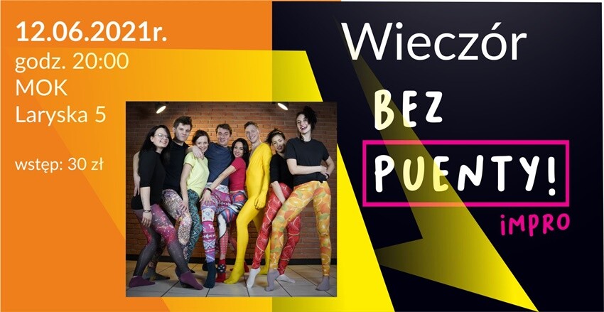Bez Puenty Impro to grupa zawodowych artystów: aktorów, muzyków i wokalistów, którzy wspólnymi siłami tworzą spektakle improwizowane. Jest to coś, co zdecydowanie wyróżnia nas na tle innych grup. Każdy z nas jest inny i każdy z nas wnosi do spektaklu coś oryginalnego. Swoje doświadczenia z desek teatralnych na terenie całego kraju z przyjemnością przelewamy na deski teatru improwizowanego. Wydarzenie odbędzie się w pełnym reżimie sanitarnym. Dostępne 50% widowni, obowiązuje nakaz zakrywania nosa i ust, dystans społeczny oraz zakaz spożywania posiłków i napojów.