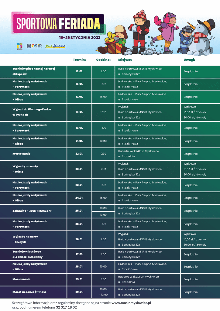 Szczegółowe informacje oraz zapisy: www.mosir.myslowice.pl, (32) 317 18 02.