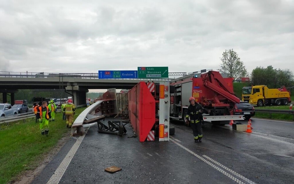 Do zdarzenia doszło w poniedziałek (17 maja) po godz. 7 rano na węźle S1/A4 w Mysłowicach. Dwa pasy ruchu autostrady w kierunku Krakowa zostały zablokowane. Spowolniony ruch pojazdów w stronę Krakowa odbywa się pasem awaryjnym.