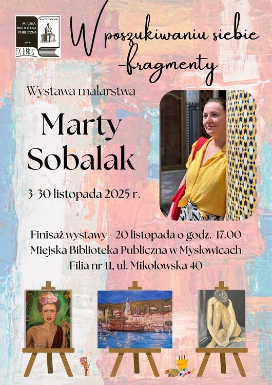 Filia nr 11 Miejskiej Biblioteki Publicznej w Mysłowicach zaprasza na wyjątkową wystawę malarstwa zatytułowaną „W poszukiwaniu siebie – fragmenty”. Autorką prac jest Marta Sobalak, artystka, która swoją pasję do malowania rozwija od lat, a obecnie, po ukończeniu weekendowych zajęć na katowickiej Akademii Sztuk Pięknych, zdecydowała się po raz pierwszy zaprezentować swoje prace szerszej publiczności.