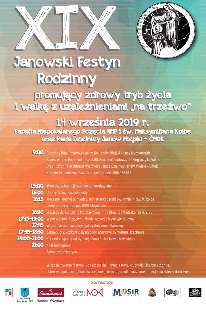 Przed nami XIX Janowski Festyn Rodzinny promujący zdrowy tryb życia i walkę z uzależnieniami „Na trzeźwo”. Na wydarzenie zaprasza Parafia Niepokalanego Poczęcia NMP i św. Maksymiliana Kolbe oraz Rada Dzielnicy Janów Miejski – Ćmok przy współpracy m.in. z UM Mysłowice, Mysłowickim Ośrodkiem Kultury, MOSiR Mysłowice i PSP Mysłowice.