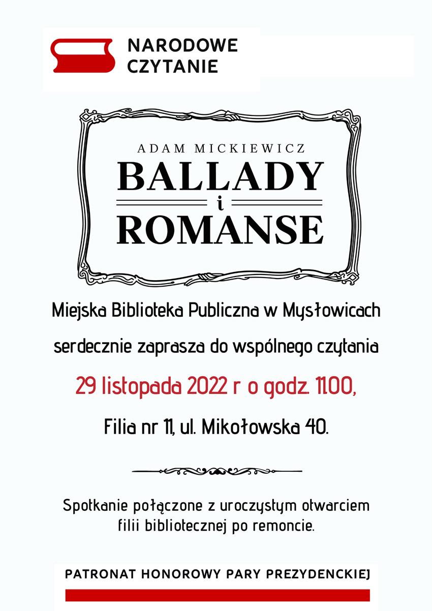 Wspólne czytanie "Ballad i romansów" Adama Mickiewicza, w dwusetną rocznicę pierwszej ich publikacji, odbędzie się 29 listopada 2022 r. o godz. 11.00 w Filii nr 11 przy ul. Mikołowskiej 40.