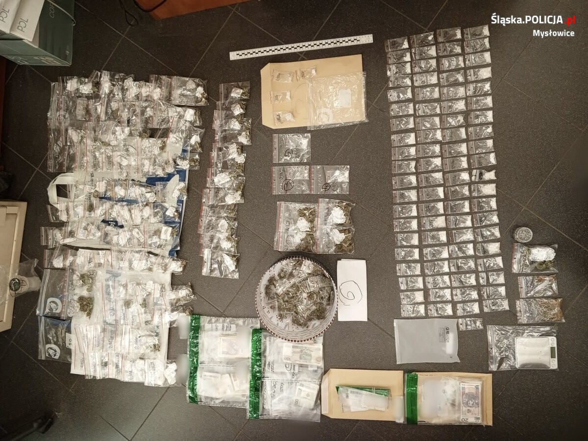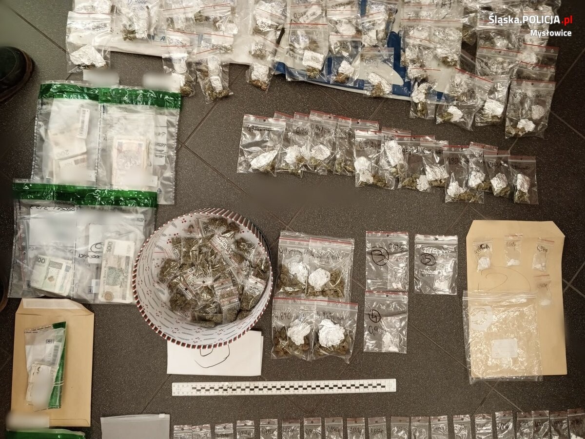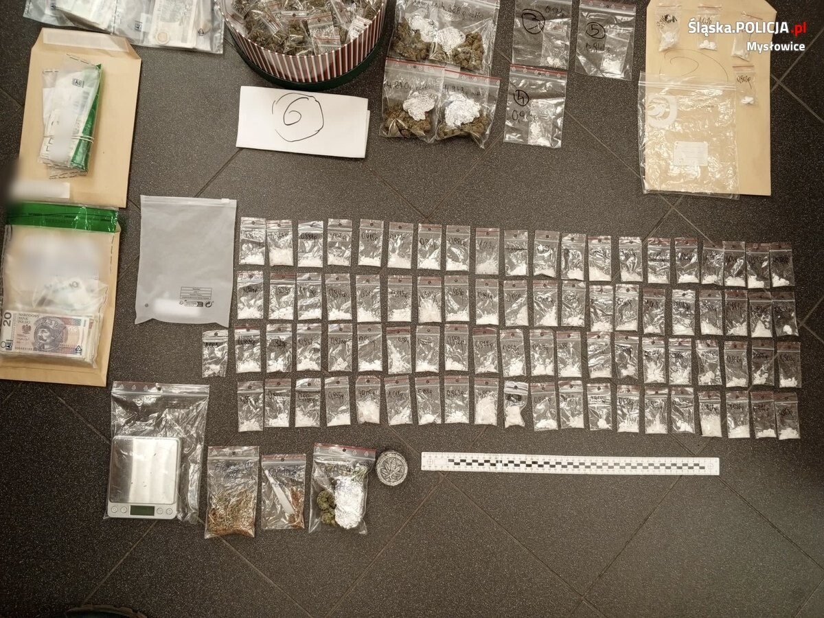 Tam stróże prawa znaleźli ponad 1150 działek dilerskich metamfetaminy, przeszło 180 porcji marihuany, wagę oraz inne przedmioty służące do porcjowania i sprzedaży narkotyków. Kryminalni zatrzymali 23-latka, który trafił do policyjnej celi, a następnie został doprowadzony do mysłowickiej prokuratury, gdzie usłyszał zarzuty za posiadanie i handel środkami odurzającymi. Na wniosek śledczych oraz prokuratora, decyzją sądu, został on tymczasowo aresztowany na 3 miesiące.