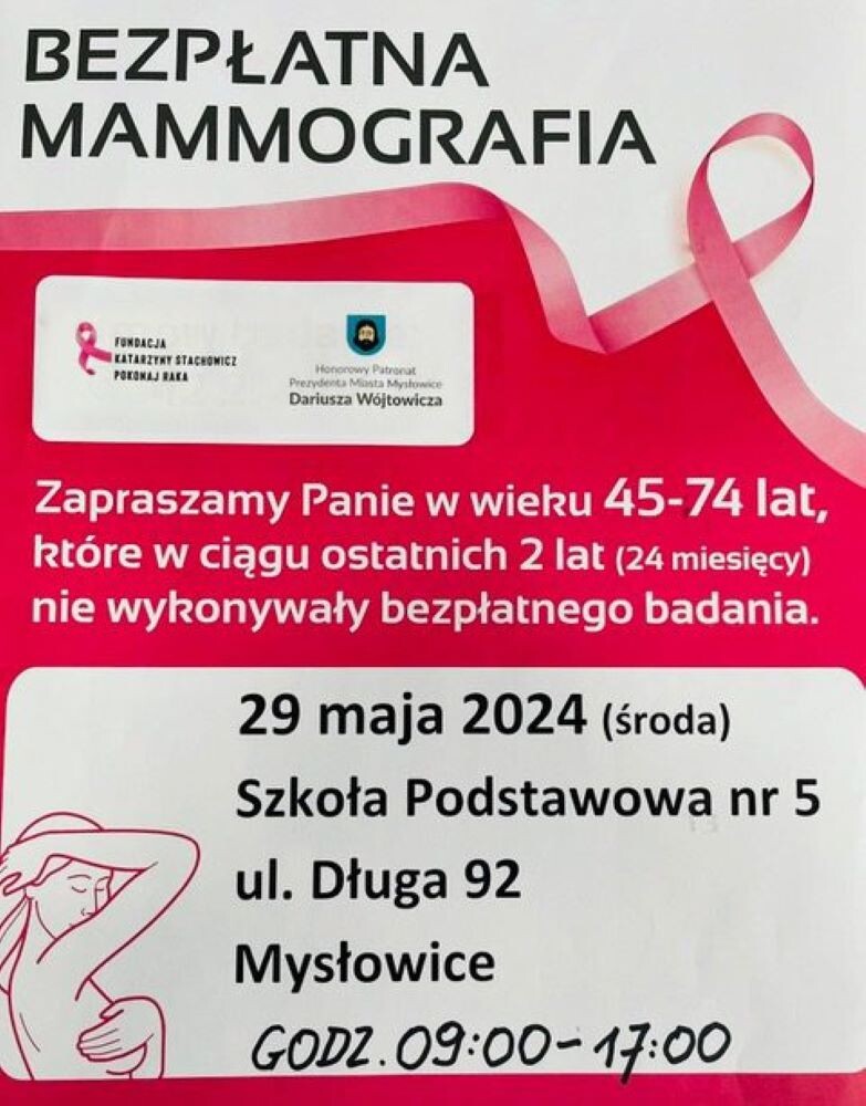29 maja w godzinach 9:00 – 17:00 na parkingu szkoły będzie mammobus w którym będzie można zrobić profilaktyczne badania raka piersi, a o godzinie 11:00 każda z Pań może dowiedzieć się, ćwicząc na fantomach jak wykonać samobadanie piersi z prelekcji poprowadzonej przez Panią Katarzynę Stachowicz z Fundacji „Pokonaj Raka”.