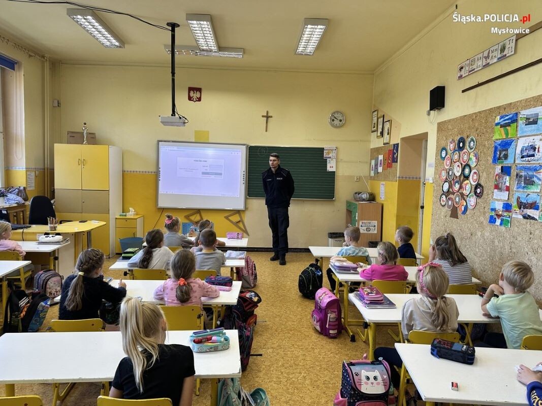Mundurowy rozmawiał z uczniami na temat tego, jak prawidłowo przechodzić przez jezdnię oraz dlaczego warto nosić elementy odblaskowe, nawet w dzień. Dzieci dowiedziały się także, jak reagować w sytuacjach zagrożenia i jak korzystać z numerów alarmowych. Przypomnienie tych zasad jest szczególnie ważne dla najmłodszych, którzy codziennie pokonują drogę do szkoły.