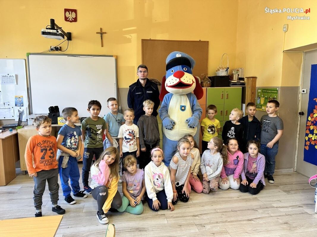 Policjant wraz ze Sznupkiem odwiedzili wczoraj pierwszaków z ZSP nr 1 w Mysłowicach. Mundurowy rozmawiał z dziećmi na temat bezpieczeństwa w trakcie drogi do szkoły, przypomniał im numery alarmowe oraz zasady i przypadki korzystania z nich, oraz odpowiedział na pytania zgromadzonych dzieci. Największą atrakcją jak zawsze był Sznupek, który chętnie pozował do zdjęć z dziećmi.