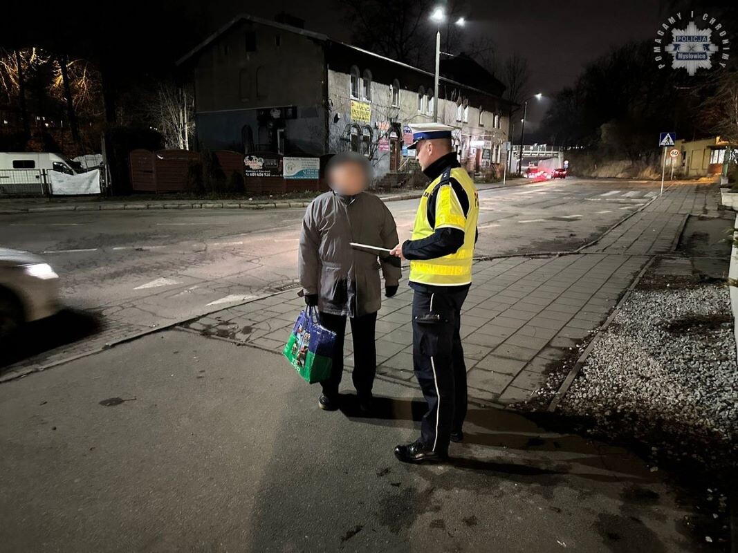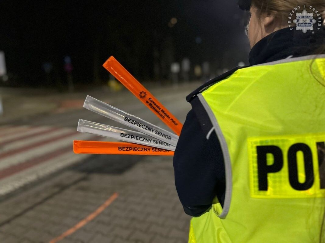 Policjanci wręczali pieszym elementy odblaskowe, poprawiające ich widoczność po zmroku.
