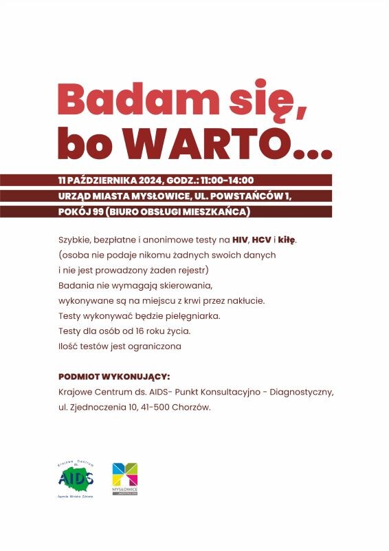 Miasto Mysłowice we współpracy z Krajowym Centrum ds. AIDS – Punktem Konsultacyjno-Diagnostycznym w Chorzowie organizuje dla mieszkańców Mysłowic w dniu 11 października 2024 r. (piątek) w Urzędzie Miasta Mysłowice, ul. Powstańców 1, pokój 99 (Biuro Obsługi Mieszkańca) od godz. 11:00 do 14:00 (lub do wyczerpania testów) akcję bezpłatnych, anonimowych, szybkich testów przesiewowych w kierunku wirusa HIV, HCV oraz kiły pod nazwą „Badam się, bo WARTO. . .”. Ilość testów jest ograniczona.