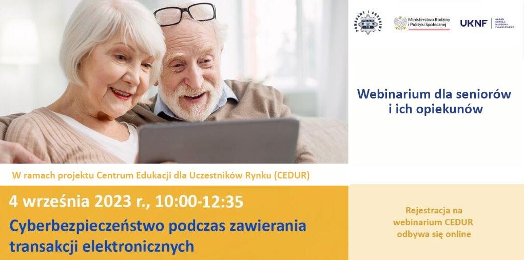 Zwiększenie świadomości w zakresie aktualnych zagrożeń spowodowanych działalnością cyberprzestępców to cel webinarium pod nazwą „Cyberbezpieczeństwo podczas zawierania transakcji elektronicznych z podmiotami rynku finansowego, ochrona konsumentów na rynku finansowym, w szczególności przed działalnością cyberprzestępców, uwzględniając takie metody oszustw, jak vishing i spoofing” organizowanego po raz kolejny przez Urząd Komisji Nadzoru Finansowego w ramach projektu Centrum Edukacji dla Uczestników Rynku – CEDUR, we współpracy z Komendą Główną Policji oraz Ministerstwem Rodziny i Polityki Społecznej.