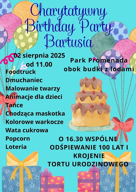 Urząd Miasta Mysłowice zaprasza mieszkańców na Charytatywny Birthday Party Bartusia, które odbędzie się 2 sierpnia w Parku Promenada (obok budki z lodami). Start o godzinie 11:00.