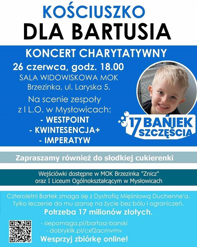 26 czerwca o godzinie 18:00 w sali widowiskowej MOK Brzezinka (ul. Laryska 5) odbędzie się koncert, którego celem jest zebranie funduszy na leczenie Bartka Banskiego – czteroletniego mieszkańca naszego miasta, walczącego z poważną chorobą genetyczną.