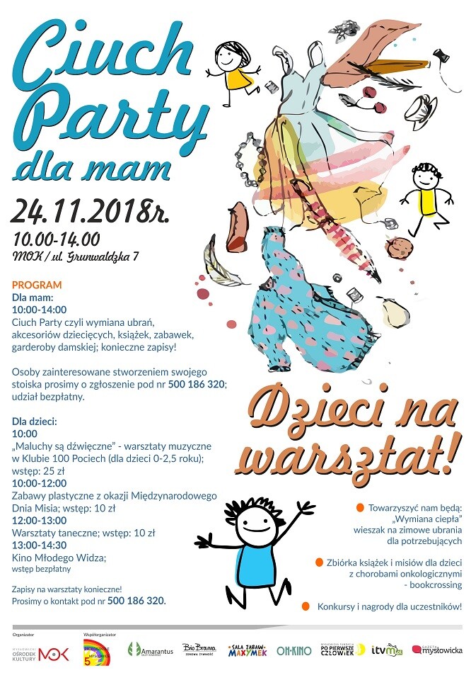 Podczas organizowanego 24 listopada w MOK-u przy ul. Grunwaldzkiej 7 wydarzenia odbędzie się cykl warsztatów: muzyczne dla maluszków oraz kreatywne i taneczne dla „starszaków”, zostanie także wyświetlona bajka. W ten sposób stworzona zostanie twórcza i bezpieczna strefa dla dziecięcej wyobraźni i wybryków. W tym samym czasie mamy będą mogły zrelaksować się podczas „Ciuch Party”. To nawiązanie do słynnych „swap’ów”, czyli towarzyskich spotkań, w ramach których można wymieniać się ubraniami, garderobą i akcesoriami dziecięcymi, książkami, zabawkami. Dla dzieci to twórcza zabawa, a dla mam przyjemny odpoczynek.