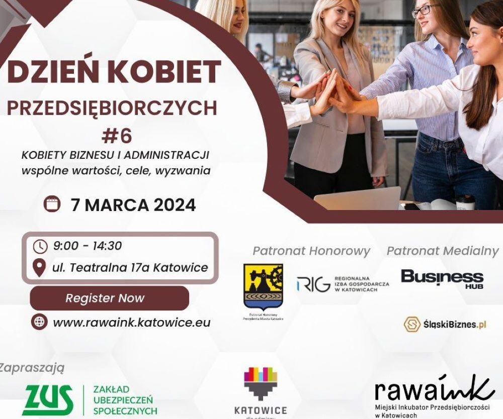 Zakład Ubezpieczeń Społecznych w Chorzowie wspólnie z Miejskim Inkubatorem Przedsiębiorczości Rawa.Ink w Katowicach zapraszają na bezpłatne wydarzenie dla kobiet pn. „Dzień Kobiet Przedsiębiorczych”, które odbędzie się już 7 marca 2024 r.