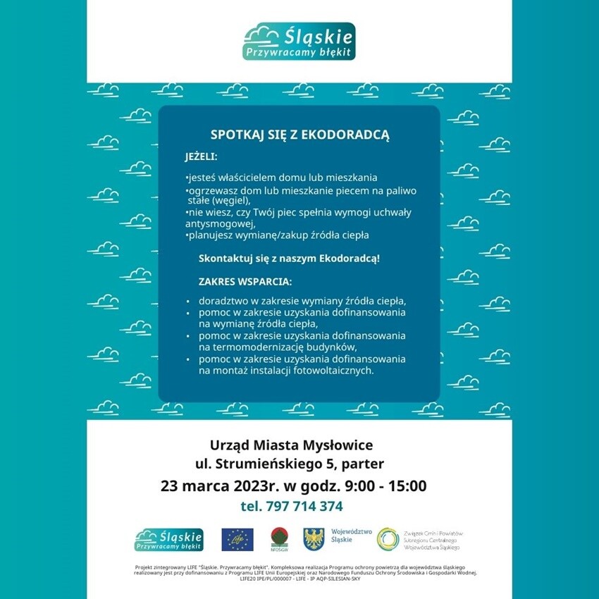 W ramach realizacji projektu zintegrowanego LIFE „Śląskie. Przywracamy błękit”. Kompleksowa realizacja Programu ochrony powietrza dla województwa śląskiego, Ekodoradca Subregionu Centralnego prowadzi indywidualne konsultacje z mieszkańcami w gminach, które bezpośrednio nie uczestniczą w projekcie.
